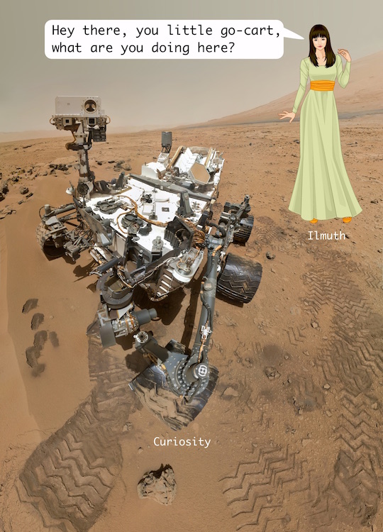 One of George Adamski’s (alleged) extraterrestrial friends, Ilmuth of Mars, meets NASA’s Mars Science Laboratory “Curiosity” rover. I used an off-duty outfit for Ilmuth, though I passed on giving her a jeweled belt. I have also ignored the question of what she’d have to be wearing to survive on that planet’s surface: mostly CO2 at -55 C and 6 millibar.